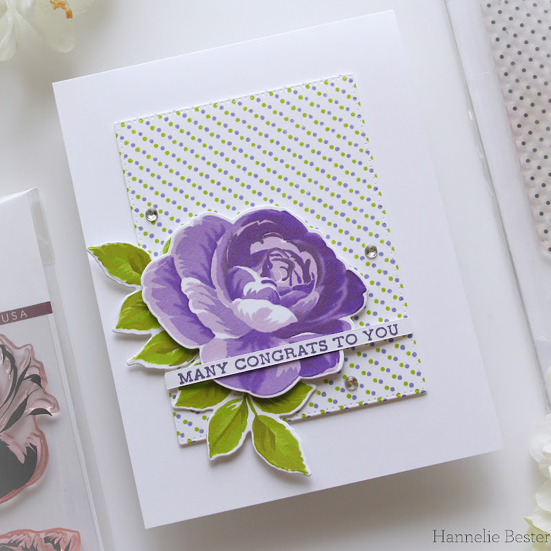 I love your beautiful purple rose, and the swiss dots stamped twice using both colours is a really interesting look and cleverly done Hannelie. x